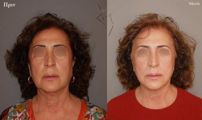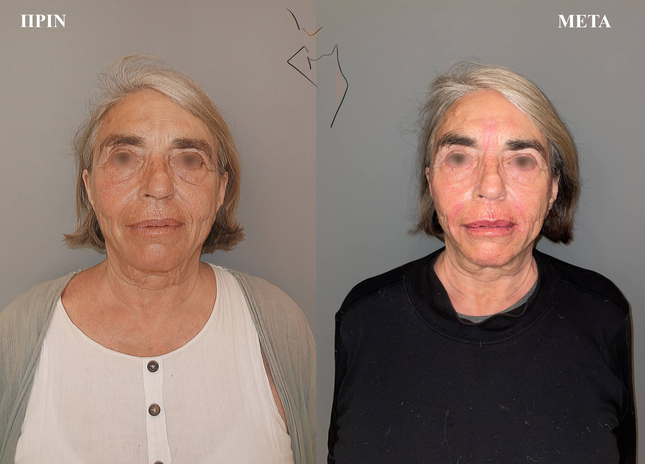 Δευτερογενές εκτεταμένο facelift και necklift σε κυρία 70 ετών. Επιπρόσθετα έγινε ενέσιμο υαλουρονικό οξύ στις ρινοπαρειακές αύλακες. Στα χείλη δεν έγινε τίποτα, γιατί περιείχαν παλαιό μόνιμο υλικό, πιθανότατα υγρή σιλικόνη.