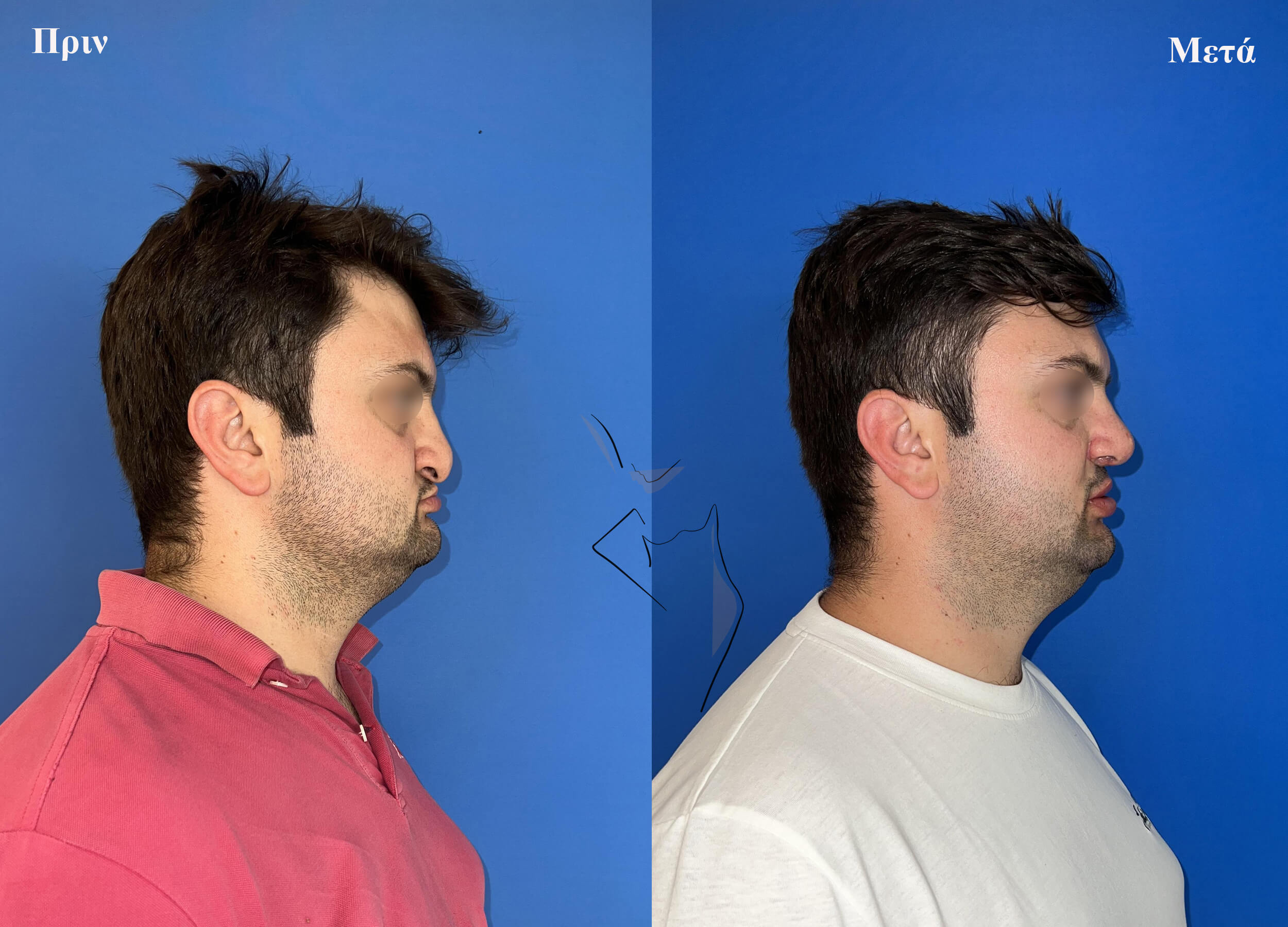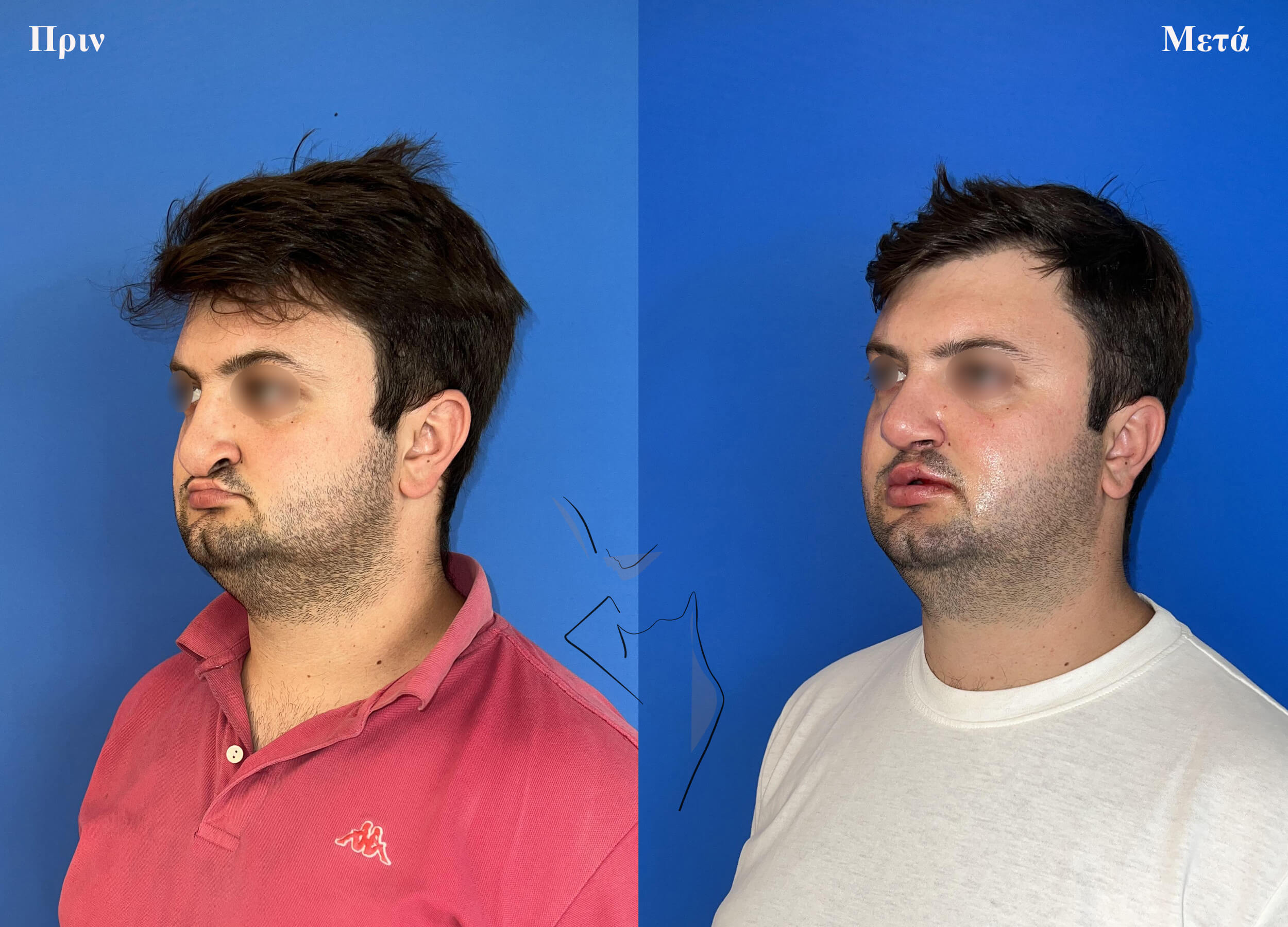 Επανορθωτική ρινοπλαστική με ισχυροποίηση, συμμετρικοποίηση και αύξηση της προβολής της μύτης σε άντρα που γεννήθηκε με χειλεοσχιστία και υπερωιοσχιστία.